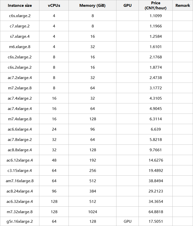 Note: Hourly unit price = Monthly unit price/30 (days)/24 (hours)