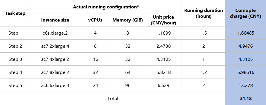1)Task Success: Suppose you submit a workflow analysis task on the platform, and only compute charges are collected for this task. The task consists of 5 steps. The table below assumes the configurations used and the running durations, and based on these, the task analysis charge is calculated to be 31.18 CNY.