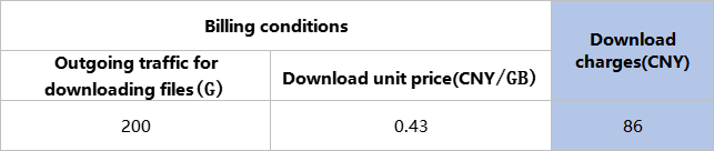 Suppose you download a file from the platform, and the operation results in a total outgoing traffic of 200G, then the download charge would be 86 CNY, as shown in the table below.