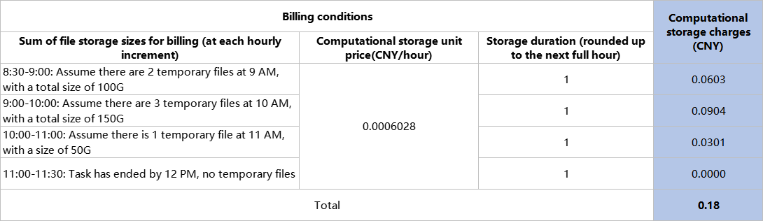 Computational storage charges are charged based on storage size and duration. Storage size is calculated based on the file size at the time of billing. If multiple files are generated during a task's runtime, the storage size of all files at the billing point is summed to calculate the computational storage size. Data storage charges are charged based on the size of the file and duration.