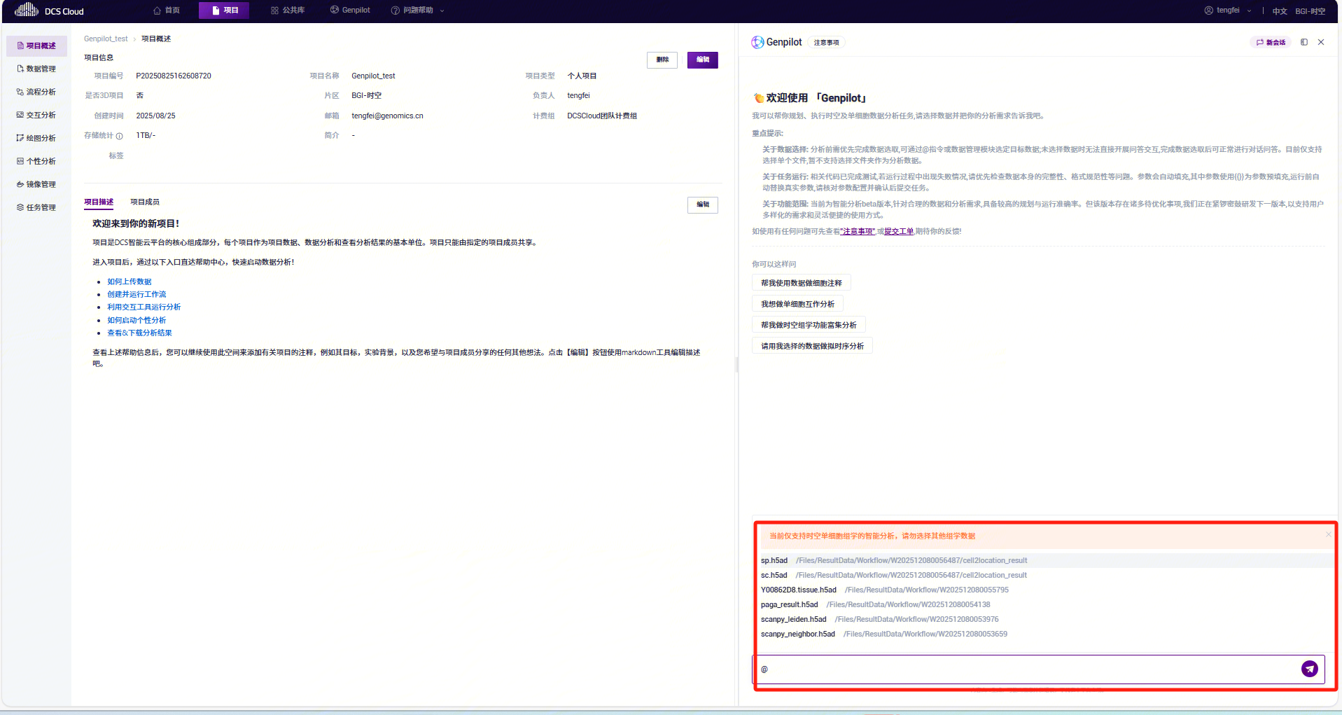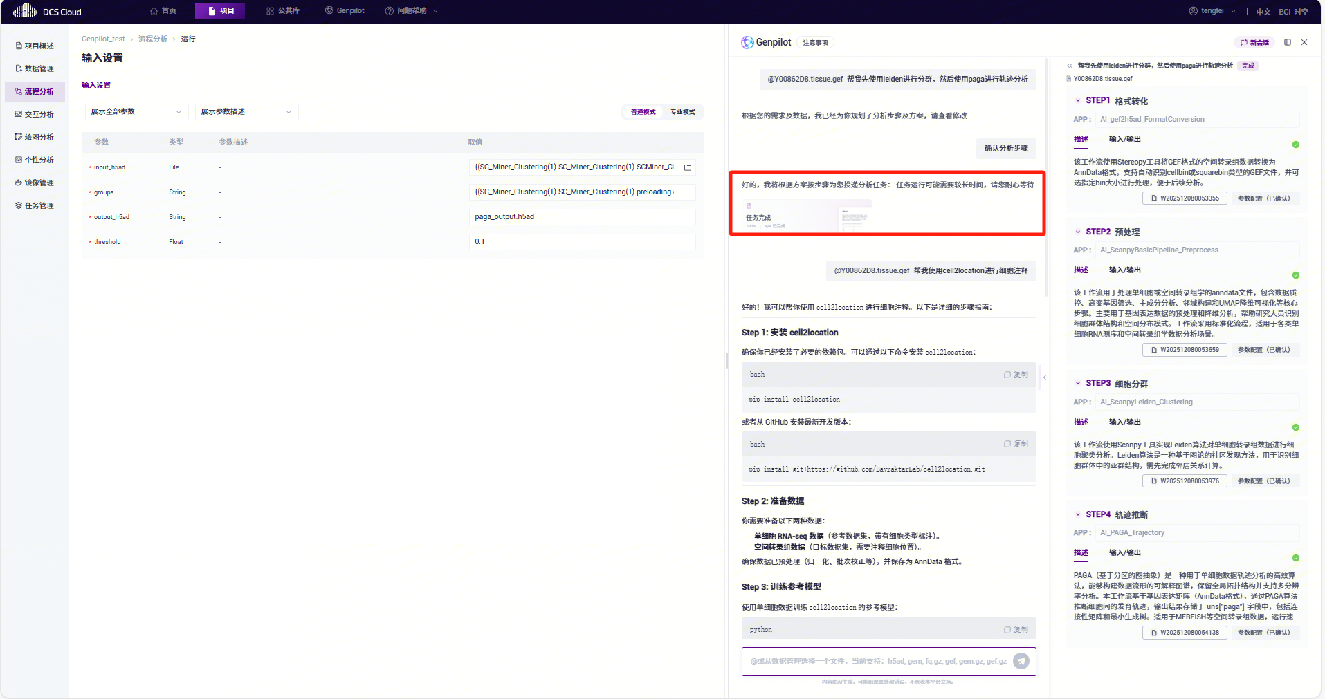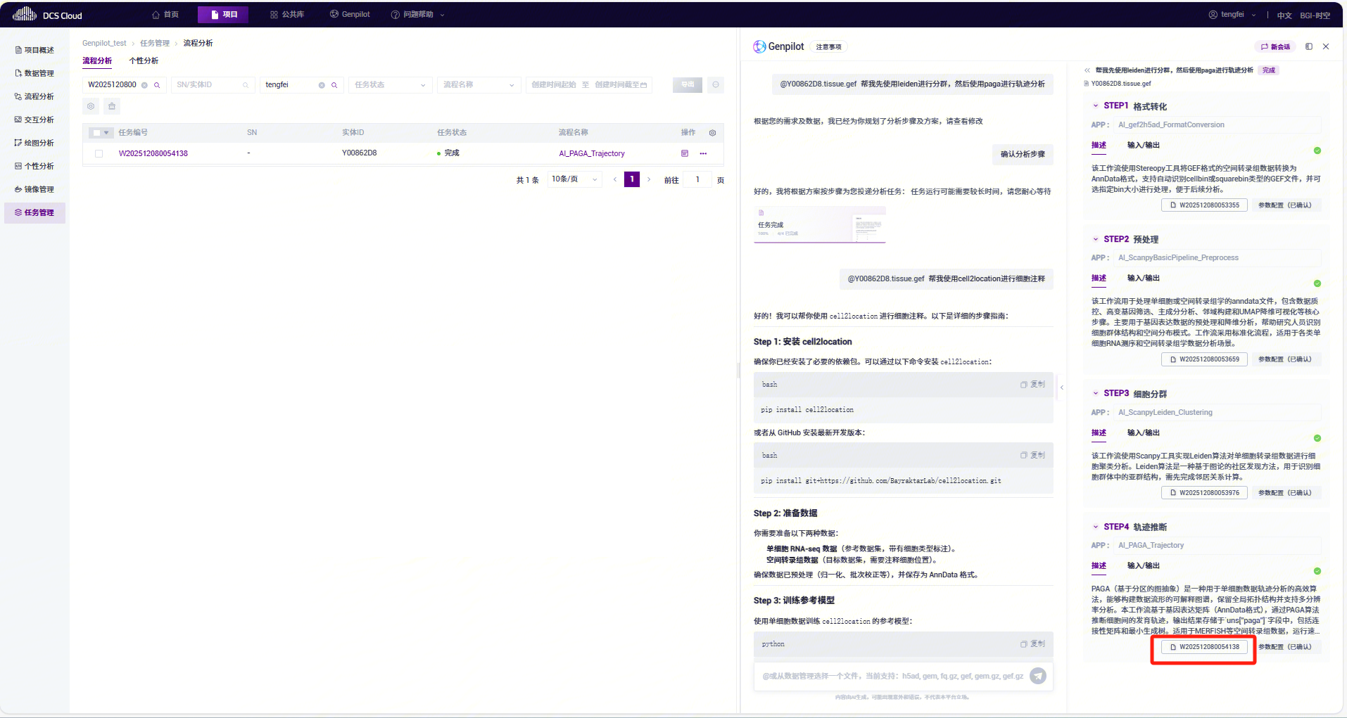 Genpilot 智能分析系统当前为1.0测试版本,已支持时空组学与单细胞分析功能。系统通过AI技术实现任务语义识别、分析规划、自动参数填写及自动任务调度运行,全程智能化高效处理分析需求。核心分析内容涵盖单细胞/空间组学数据的预处理、降维、聚类、注释、拟时序分析、细胞间互作分析及基因功能富集分析,同时支持调用用户在DCS云平台的自有WDL进行单细胞/时空组学任务规划。后续系统将持续拓展分析内容与组学覆盖范围,敬请期待。