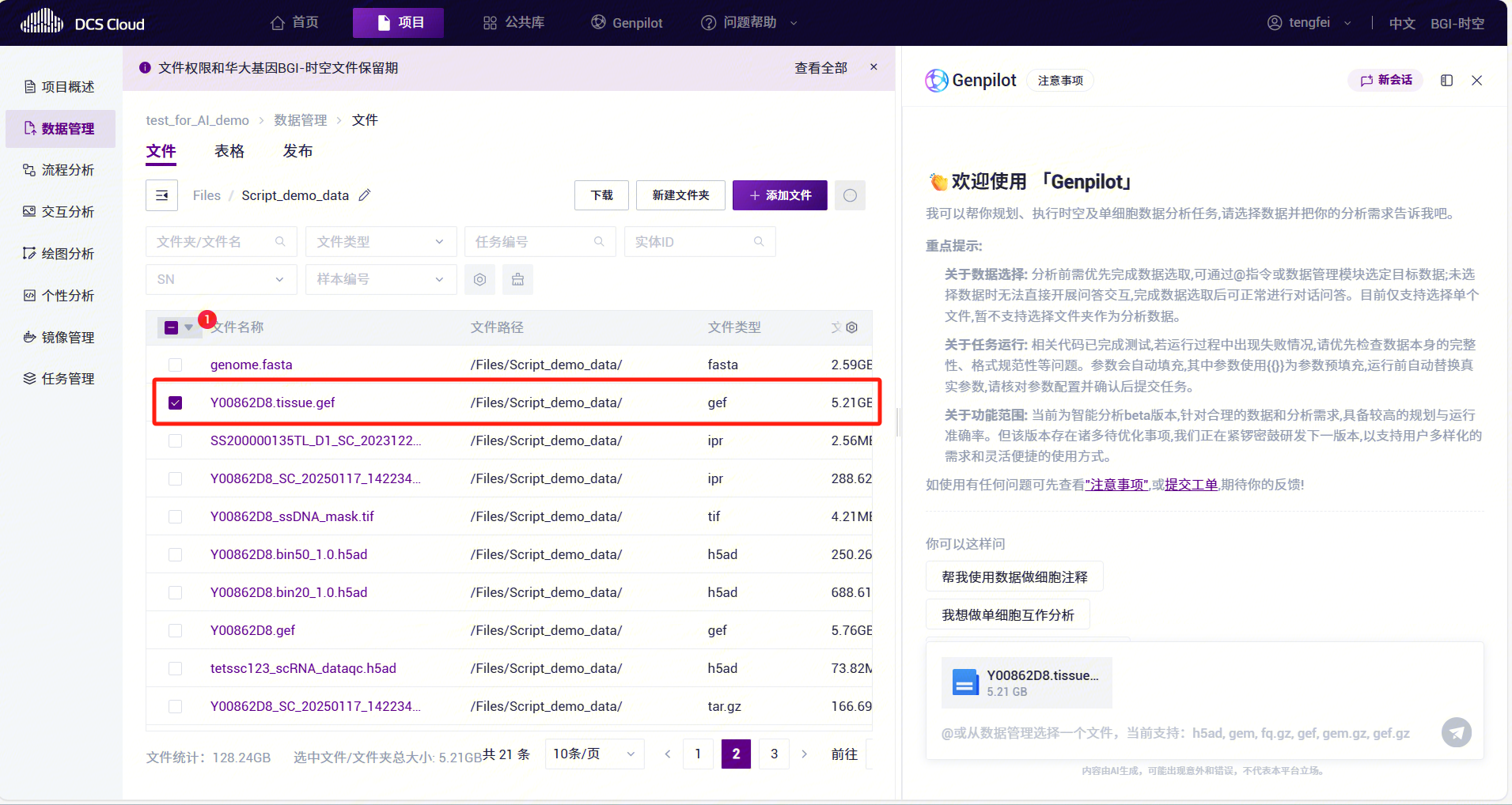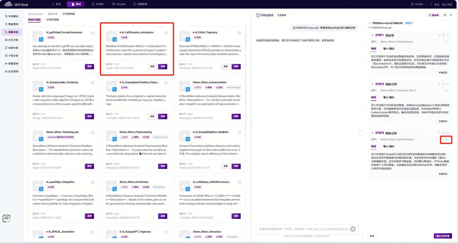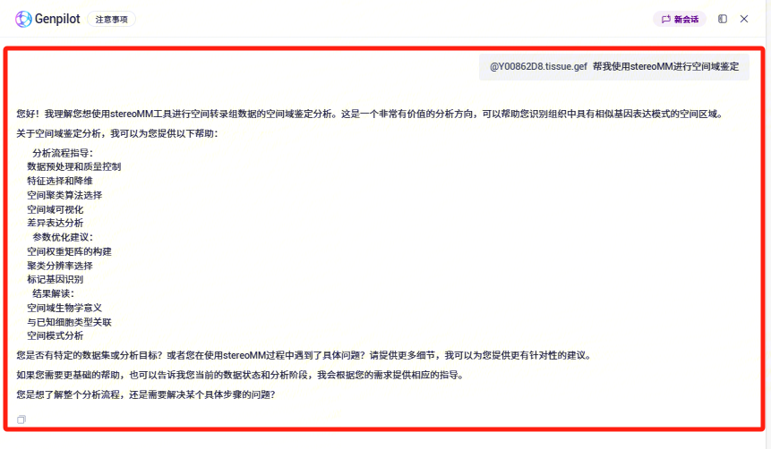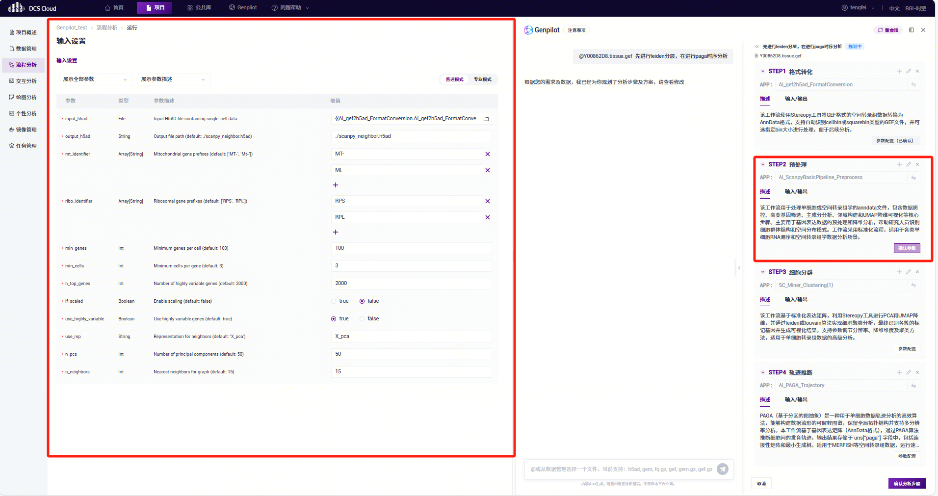 Genpilot 智能分析系统当前为1.0测试版本,已支持时空组学与单细胞分析功能。系统通过AI技术实现任务语义识别、分析规划、自动参数填写及自动任务调度运行,全程智能化高效处理分析需求。核心分析内容涵盖单细胞/空间组学数据的预处理、降维、聚类、注释、拟时序分析、细胞间互作分析及基因功能富集分析,同时支持调用用户在DCS云平台的自有WDL进行单细胞/时空组学任务规划。后续系统将持续拓展分析内容与组学覆盖范围,敬请期待。