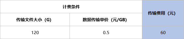 假如您在平台DCS-华南1片区A项目成功复制120G文件到BGI-时空片区B项目,则A项目将产生60元的数据传输费用,如下表所示。