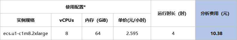 个性分析仅收取计算费用。假如您在平台投递了一个个性化分析任务,下表假设了使用配置及运行时长,并据此计算出任务分析费用为4.84元。