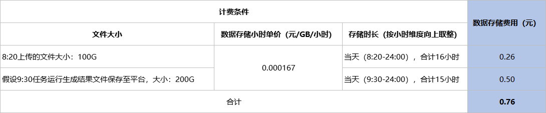计算存储费用按照存储大小和时长收费,存储大小以费用出账当时的文件大小统计,如果一个任务运行过程中产生多个文件,将出账时点下所有文件的存储大小求和,以求和数为计算存储大小;数据存储费用按照文件大小和时长收费。