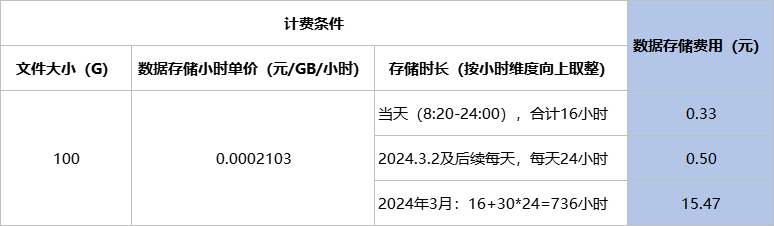 假如2024.3.1上午8:20您在平台上传了一个100G的文件至您的项目A,且该项目无其他文件数据,则项目A不同存储时长的数据存储费用如下表。
