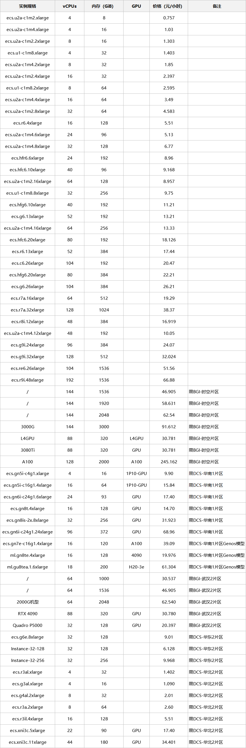 特别说明:除阿里云、华为云、火山云外的其他片区,若您申请的任务资源无匹配的机型,平台将按规格最接近的机型单价进行计费。如:您申请CPU:2,内存:4的资源,最接近的机型为ecs.u1-c1m2.xlarge(CPU:4,内存:8),则该任务将按0.912元/小时的单价进行计费。