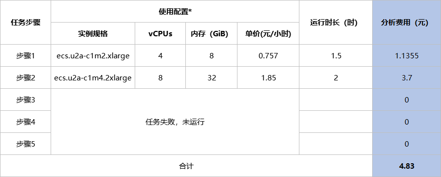 若上述示例中您投递的为非平台官方工作流任务,且在运行步骤3过程中任务失败,则仅计算步骤1、步骤2的分析费用为4.83元: