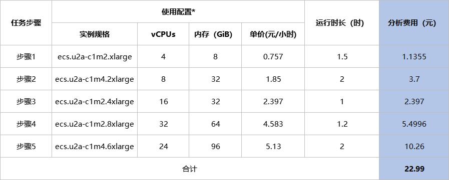 1)任务成功:假如您在平台投递了一个流程分析任务,该任务仅收取计算费用。任务包含5个步骤,下表假设了使用配置及运行时长,并据此计算出任务分析费用为22.99元。