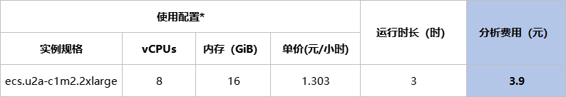 个性分析仅收取计算费用。假如您在平台投递了一个个性化分析任务,下表假设了使用配置及运行时长,并据此计算出任务分析费用为3.9元。
