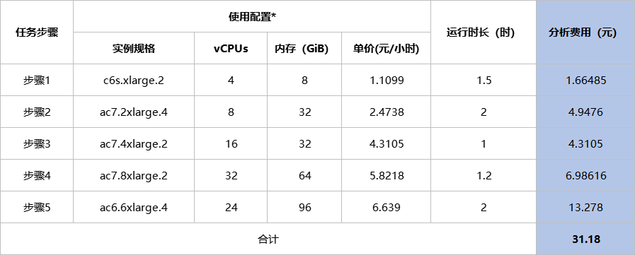 1)任务成功:假如您在平台投递了一个流程分析任务,该任务仅收取计算费用。任务包含5个步骤,下表假设了使用配置及运行时长,并据此计算出任务分析费用为31.18元。