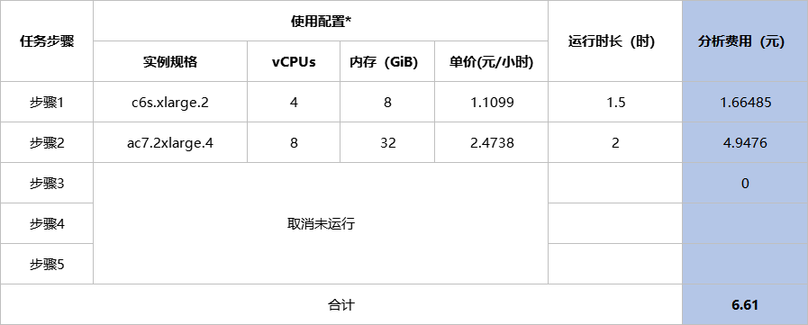 若上述示例中您在运行步骤3过程中取消了任务,则仅计算步骤1、步骤2的分析费用为6.61元。
