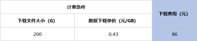 假如您在平台下载文件,该操作共流出流量200G,则下载费用为86元,如下表所示。