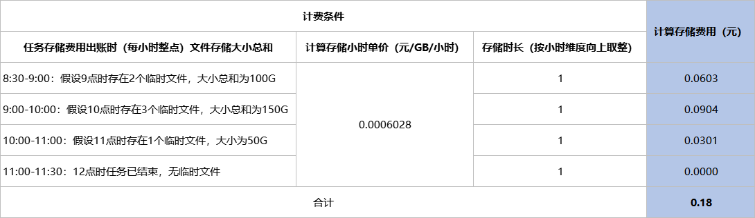 假如2024.3.1上午8:30您在平台项目B投递了一个分析任务,11:30任务结束,且期间该项目无其他分析任务。下表假设了计费条件,并据此计算出项目B此期间的计算存储费用为0.18元。