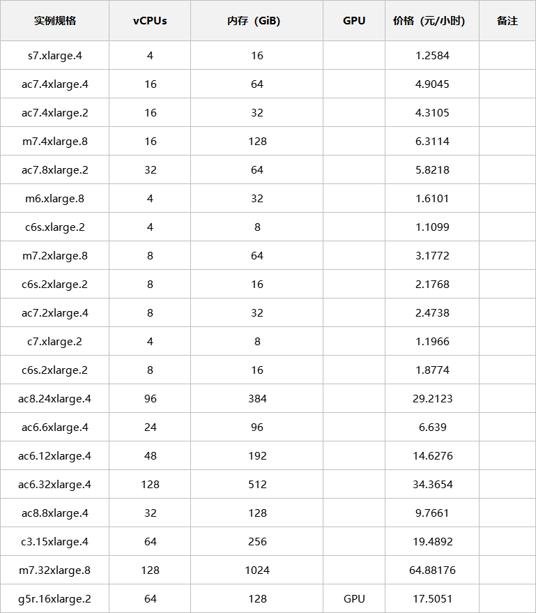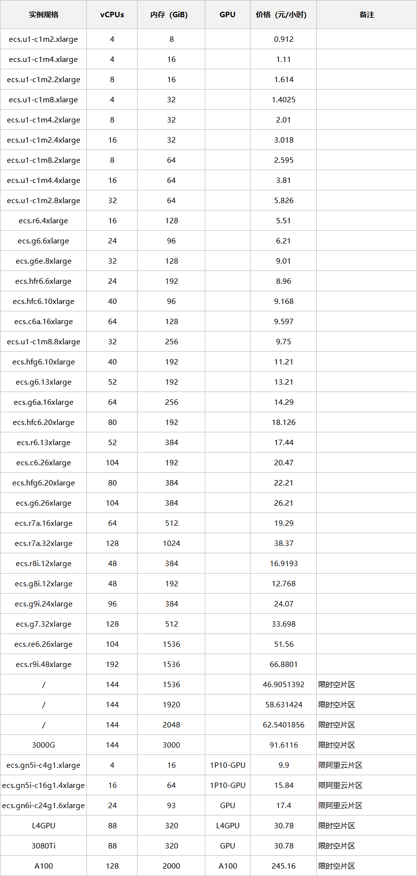- 实例规格:用于运行任务的服务器规格,不同规格代表不同的CPU和内存,价格也有所不同。