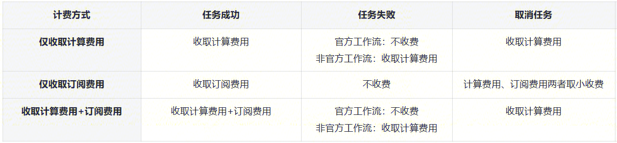 计算费用按照“占用某种特定配置(实例规格)的计算节点的时间长度”进行收费,如果某个任务涉及到多个步骤,平台将计算每个步骤的计算费用,然后将所有步骤的费用求和,从而得出当前任务的总计算费用;订阅费用按照平台或创作者指定的费用按任务次数进行收费。