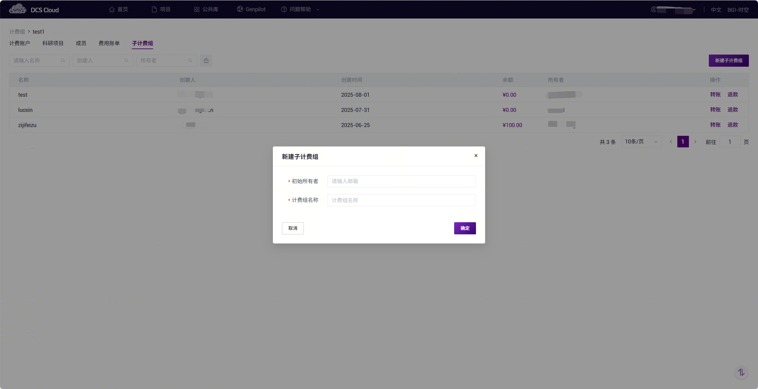 如您需新建计费组,请联系平台官邮cloud@stomics.tech申请。