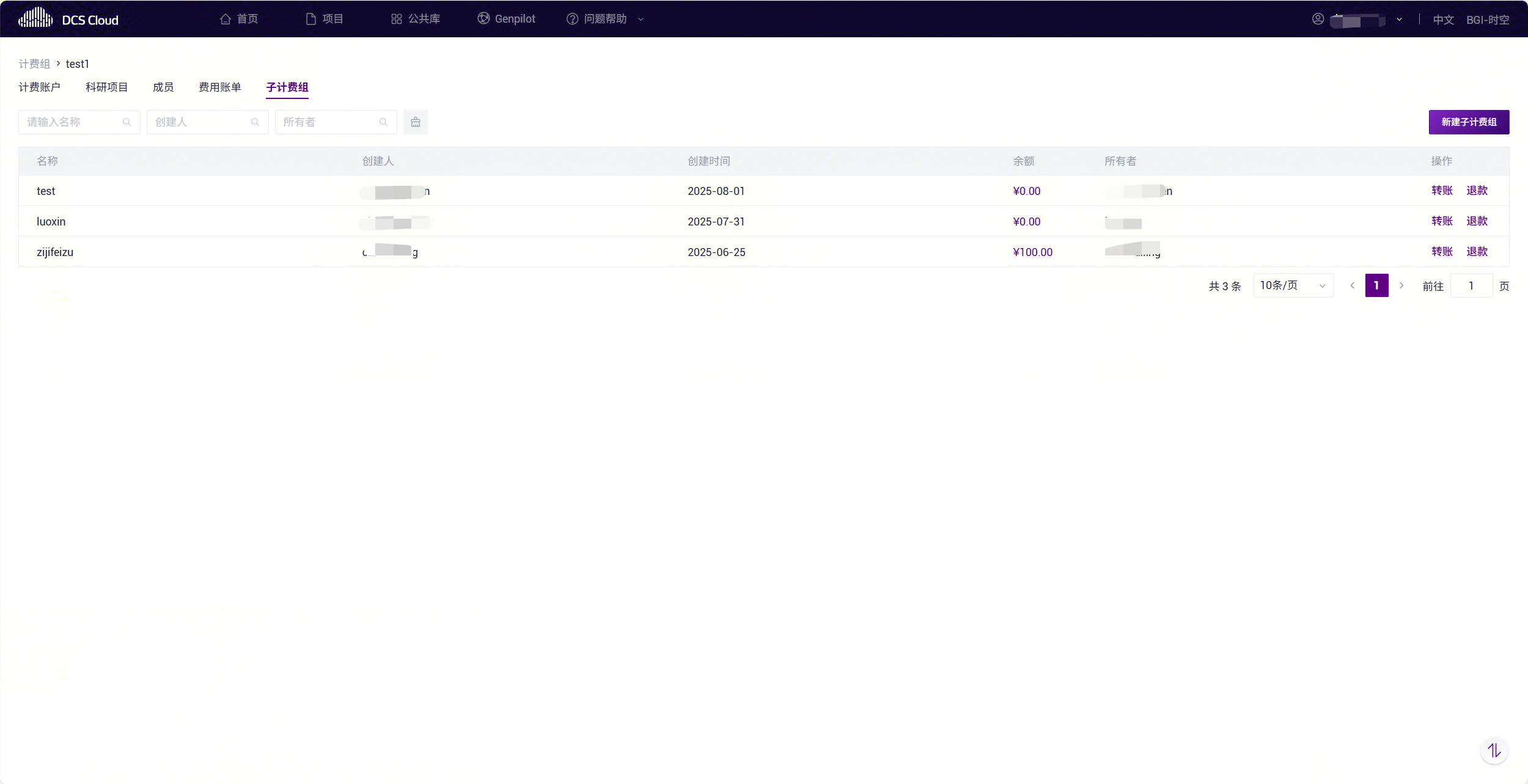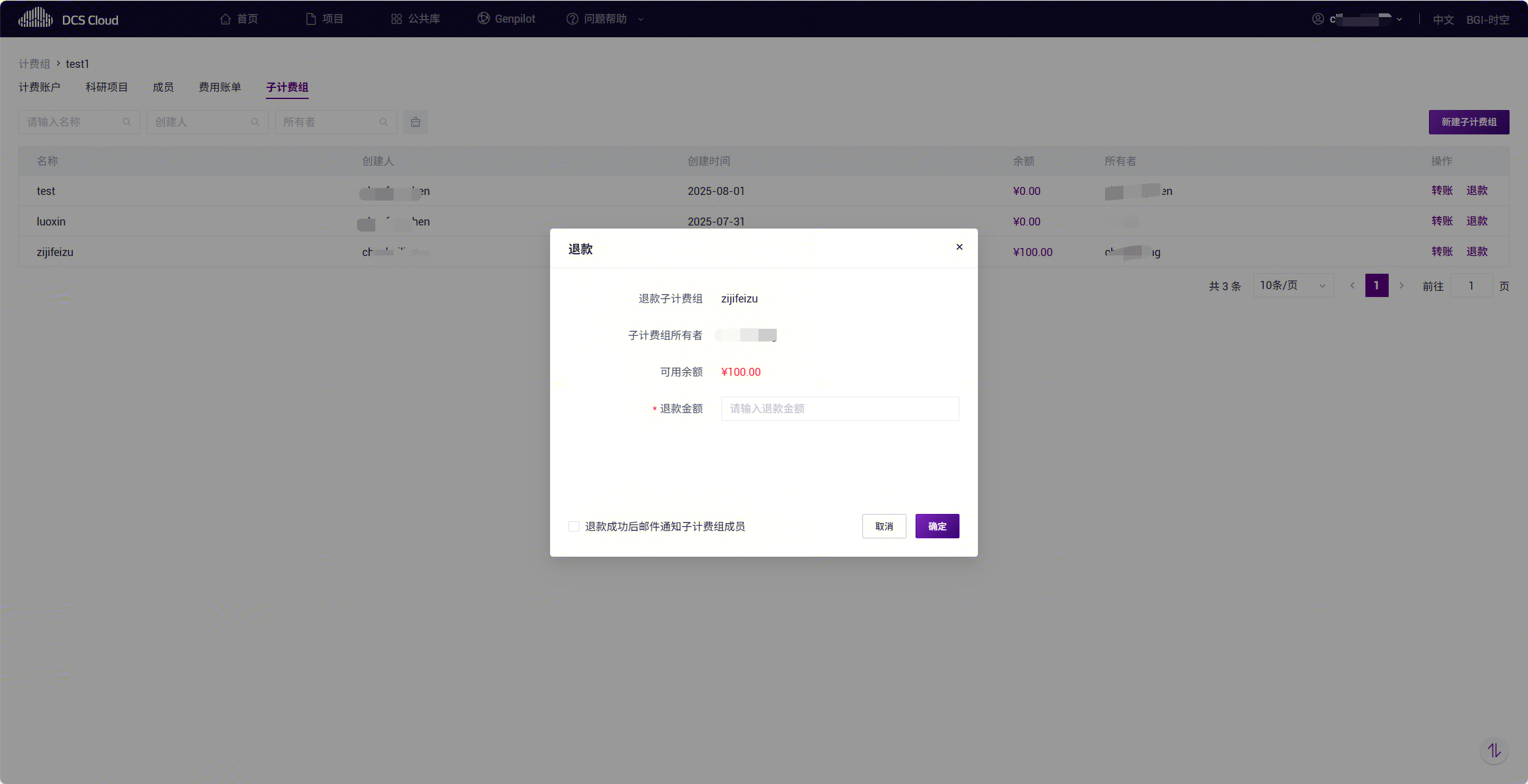 - 退款时,子计费组名下的项目不能有未完成费用结算的任务,如:排到中、运行中、入仓中、费用计算中的任务。