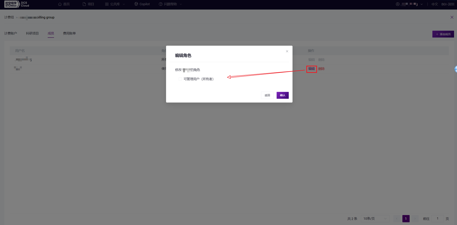 需留意:如果当前计费组有且仅有一个所有者,无法编辑该成员角色也无法删除该成员。