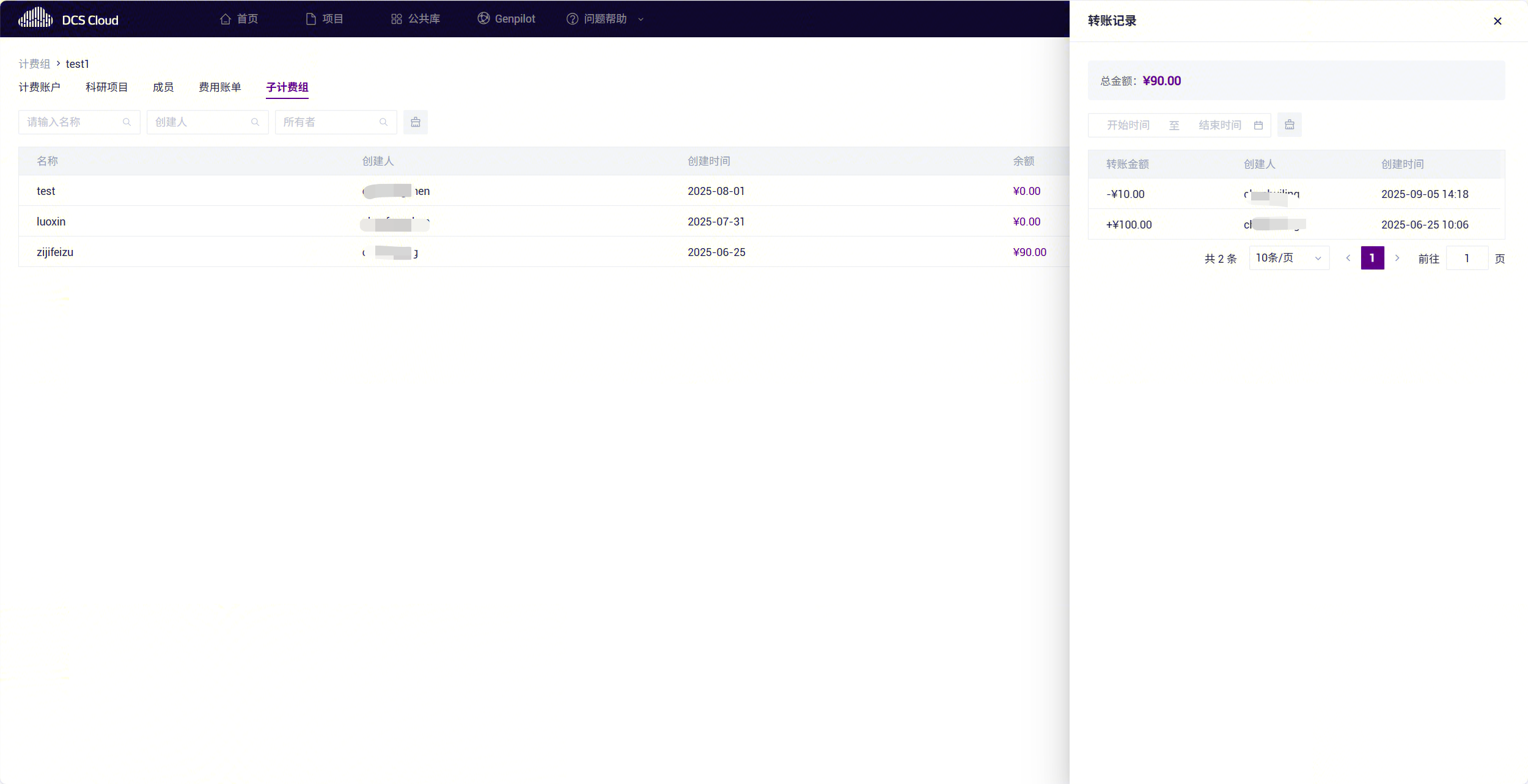 点击转账,可向子计费组转账。转账金额不能超过主计费组目前的余额。