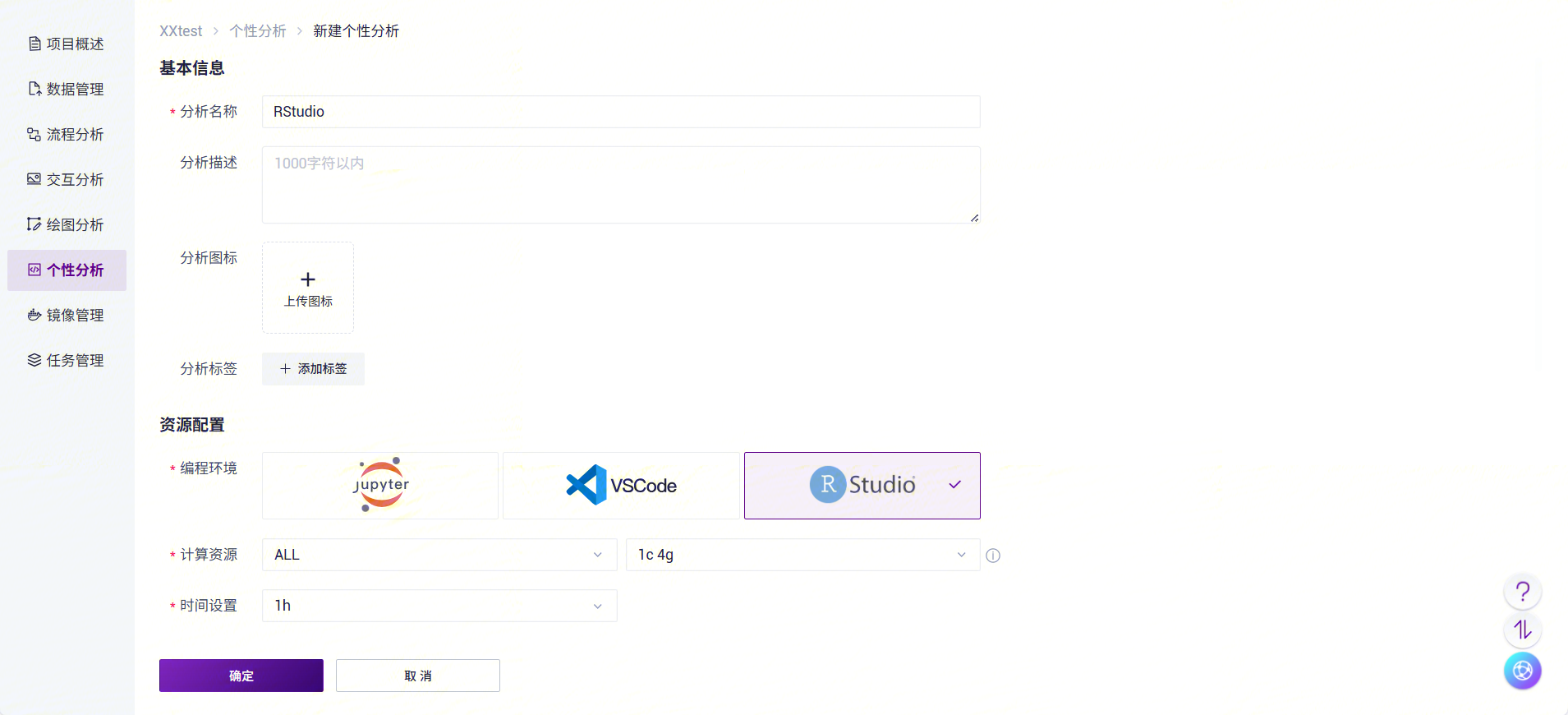 个性分析新增RStudio入口,新建个性分析时,选择【RStudio】编程环境