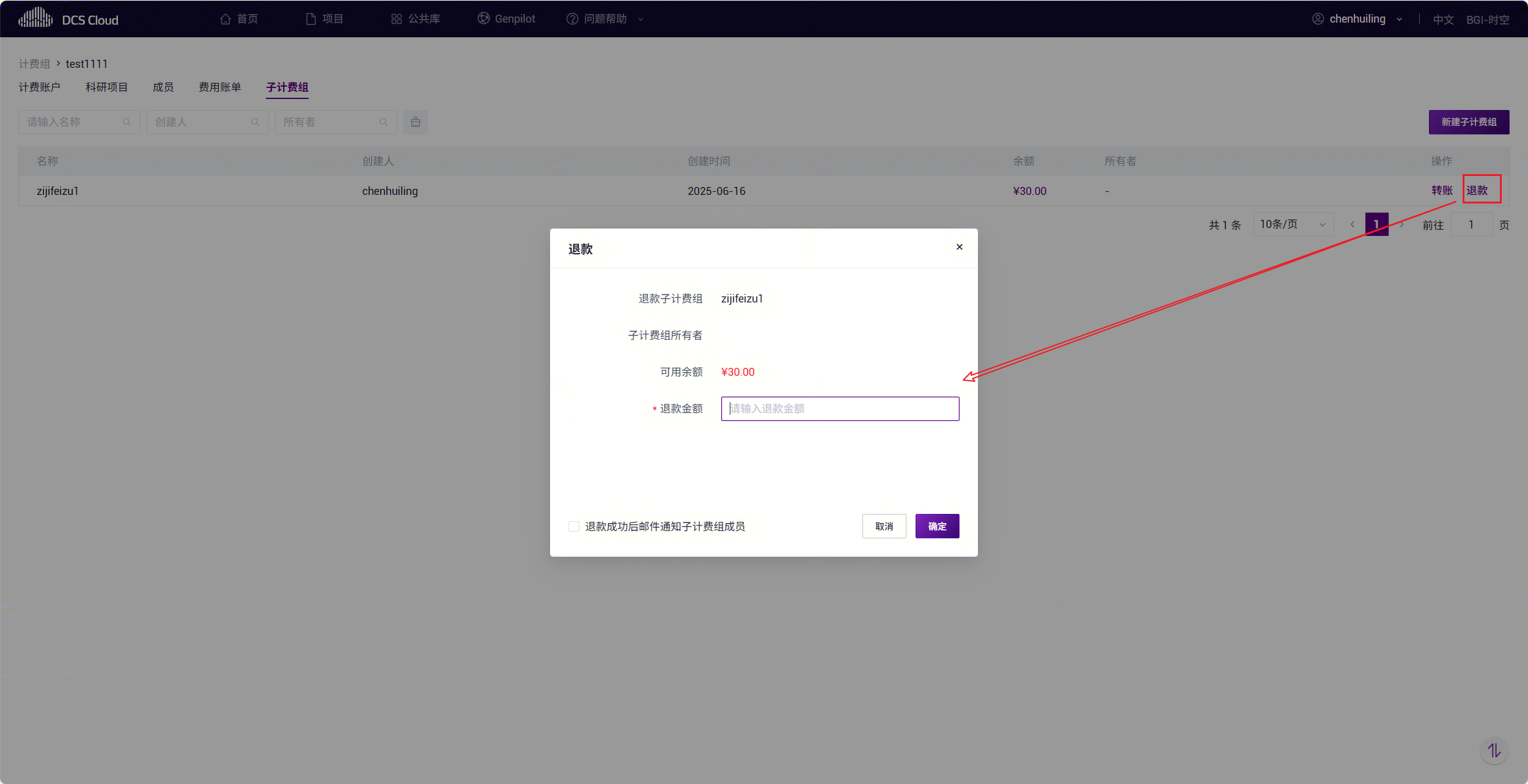 注意,退款时,子计费组下的项目不能有运行中的任务或未结算的费用。