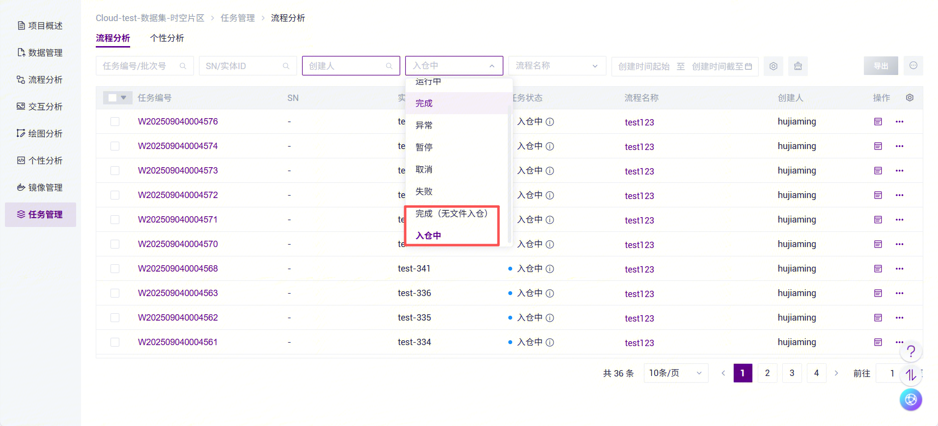 该功能优化任务生命周期状态,从“运行中”状态剥离数据入仓过程,新增【入仓中】、【完成无文件入仓】状态