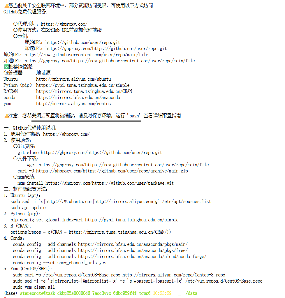 登录个性分析,进入terminal后,加载并提示用户构建镜像常用的源和代理方式,方便用户选取合适的源。首次进入terminal时加载,输入"bash"可再次显示提示内容。