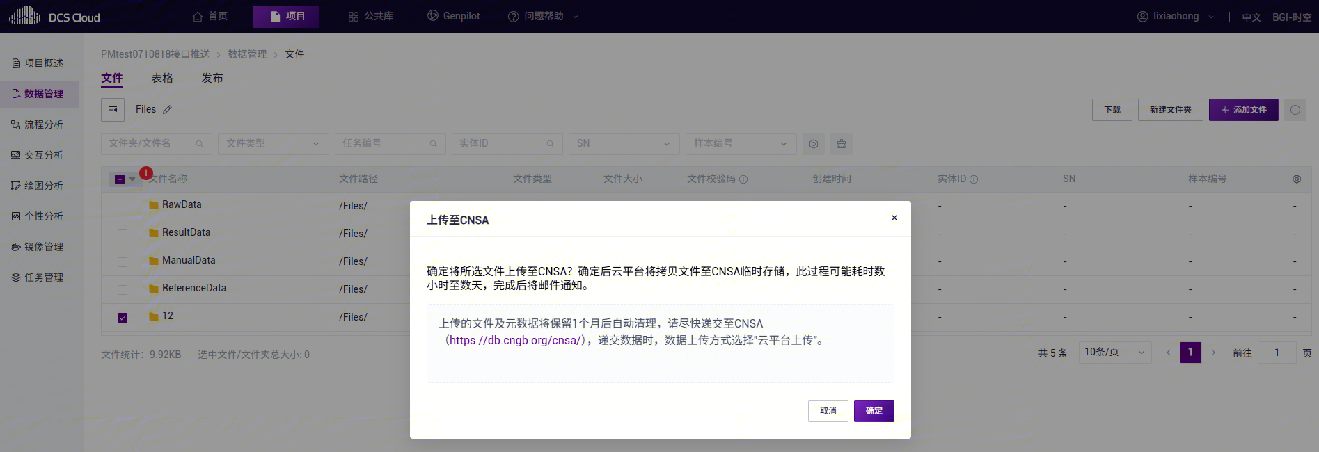 由于cnsa业务迁移至火山云,云平台从7月起关闭了数据递交cnsa入口。目前cnsa业务重新开放,故云平台放开递交入口(即按钮【上传至CNSA】),实现用户数据递交至火山云cnsa。