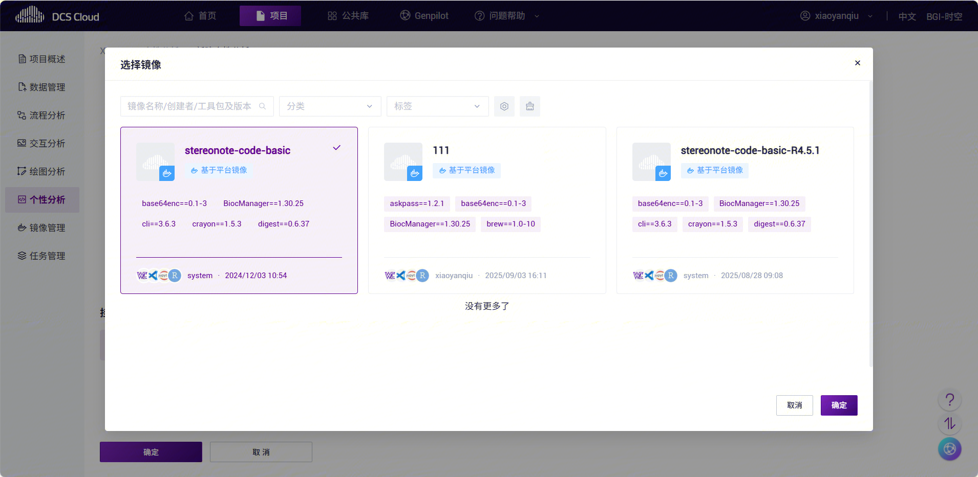 选择包含RStudio的镜像环境,如“stereonote-code-basic”镜像,保存分析空间后,【运行】即可进入RStudio环境。