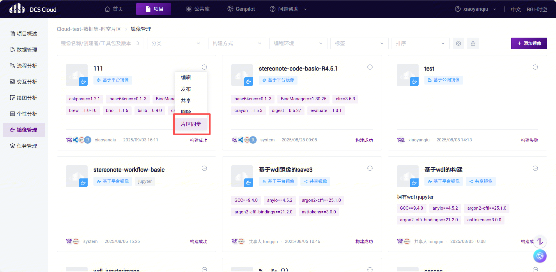 该功能用户将个人的镜像同步到所在的片区,方便用户在不同的片区使用已经构建好的镜像。点击【片区同步】按钮,选择项目共享的目标片区后,进入对应片区的镜像管理模块即可使用
