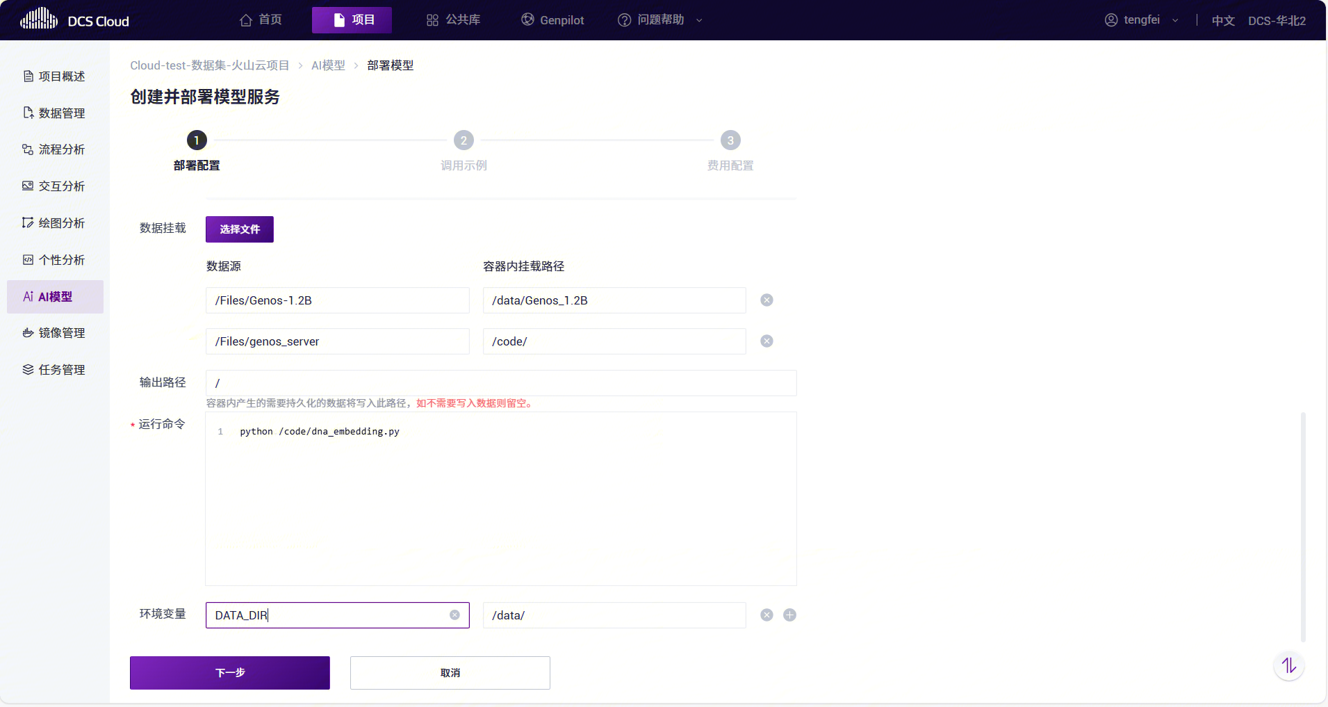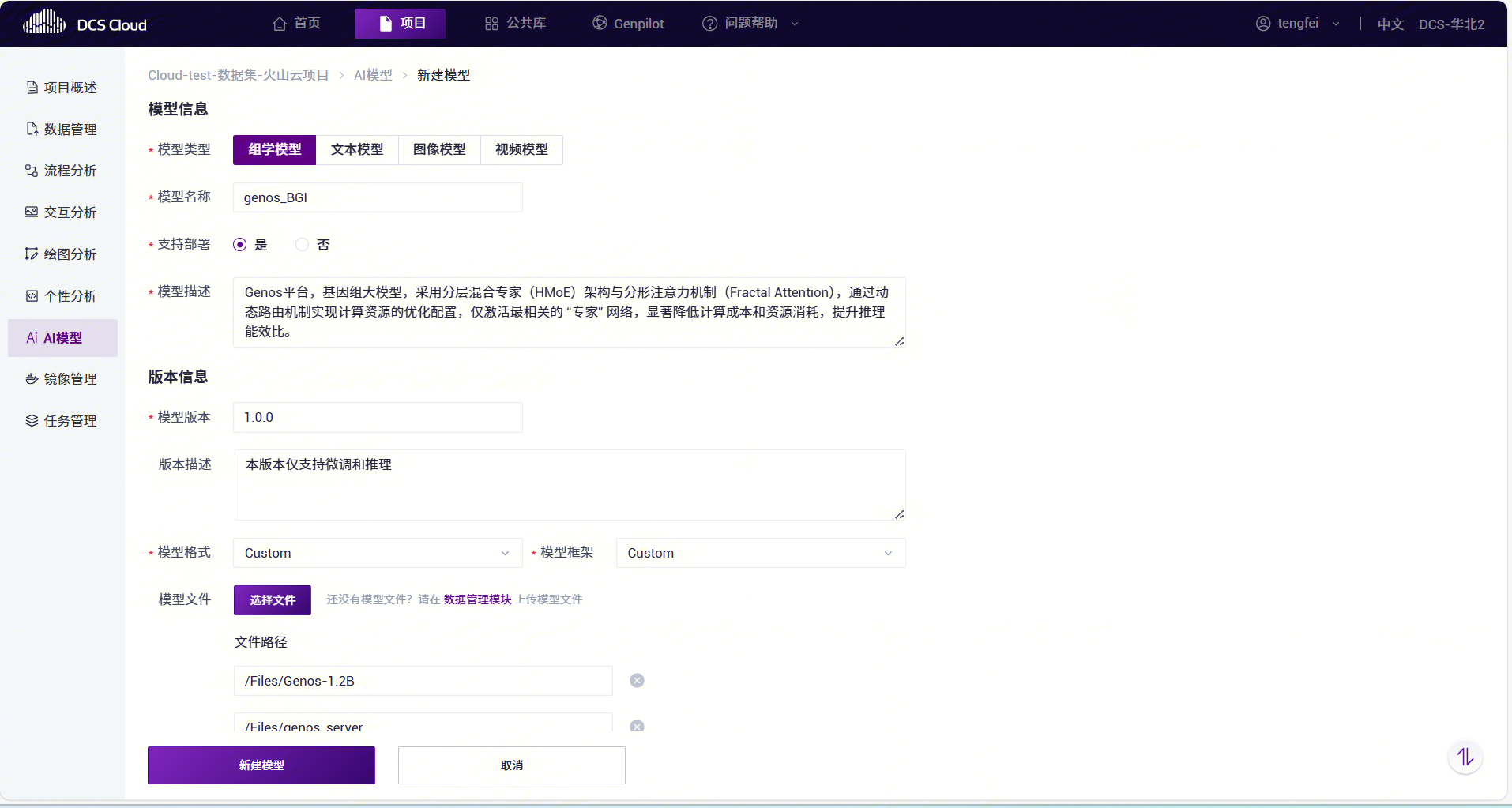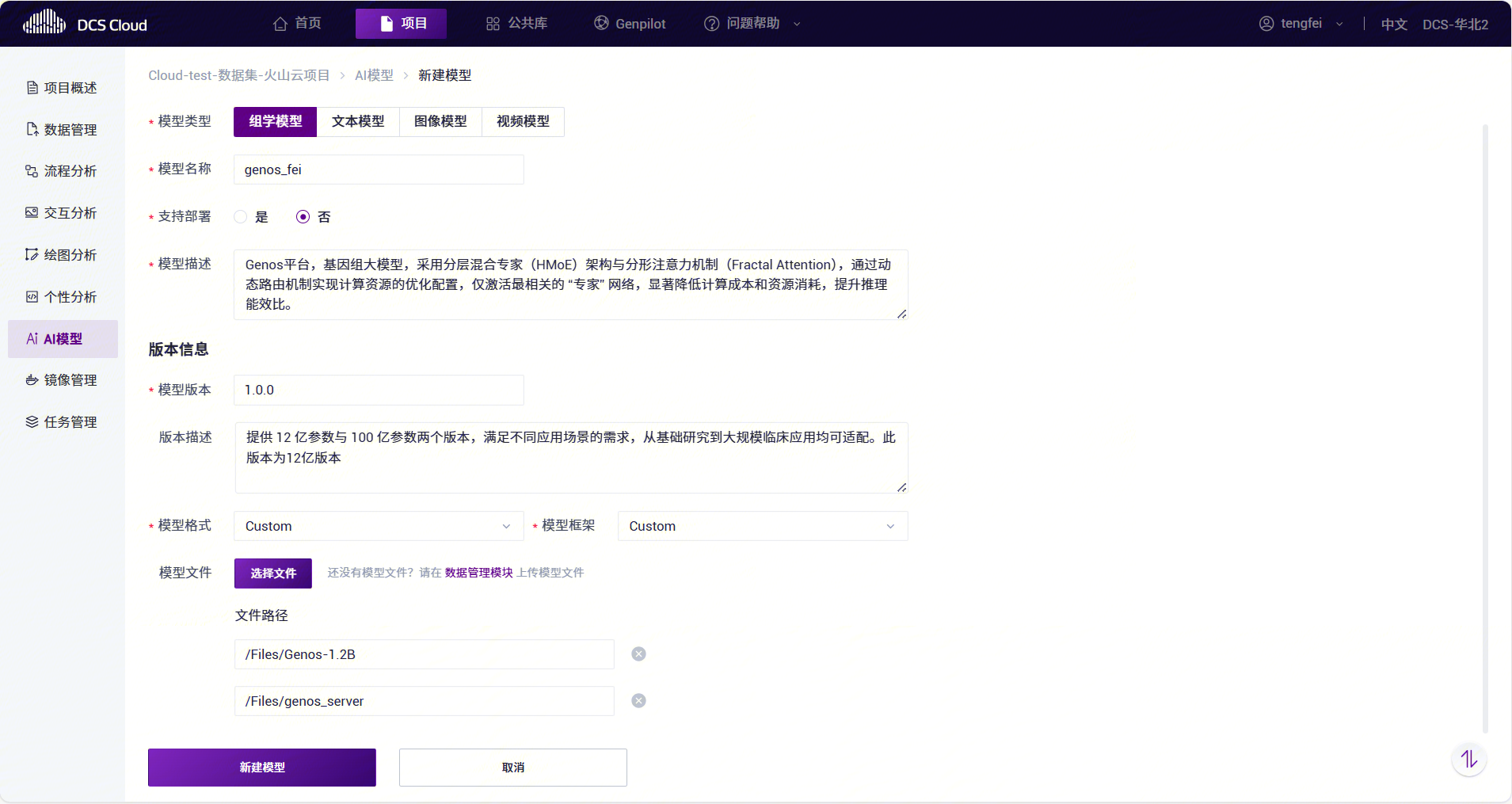DCS AI 模型面向生物信息模型开发者,提供了从开发、训练、微调、部署、发布、调用的全链路解决方案。 无论您是需要探索生命科学的垂类模型(如 Genos),还是自然语言的通用大模型(如 Qwen, DeepSeek 等),我们都能提供统一的高效管理体验。让复杂的 AI 资产变成触手可及的标准 API,赋能企业智能化创新。
