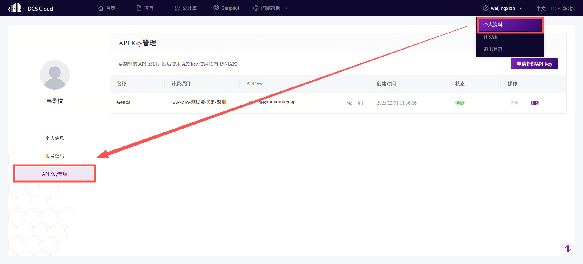您可以在「个人中心」创建个人的 API Key。并复制生成的 API Key。