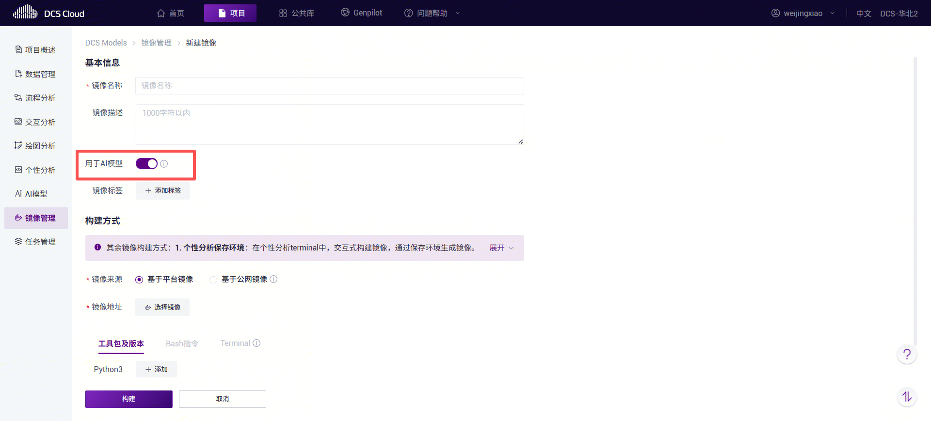用于模型部署的镜像,构建时需要将“用于 AI 模型”开关打开。
